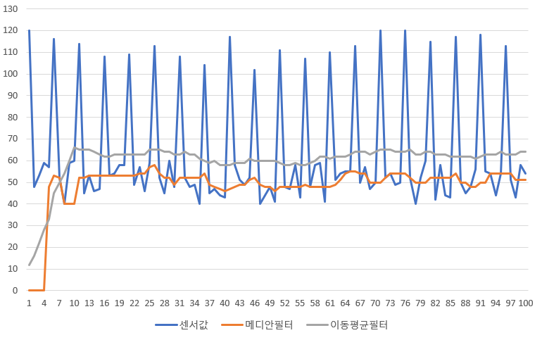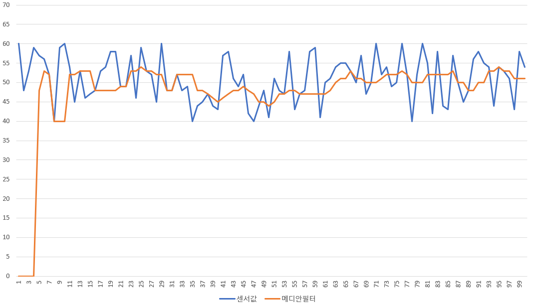 위의 그림에서 파란색은 로우데이터인 센서값을 나타냅니다. 여기서 실제 값은 50이고 로우데이터는 실제 값에서 -10 ~ 10까지의 오차를 가지게됩니다. 주황색은 메디안필터의 구간을 10으로 적용한 결과입니다. 그림에서 보시는바와 같이 주황색의 경우 5개 이후부터 메디안필터의 값이 실제 값과 유사합니다. 초기에 메디안필터 배열의 값은 모두 0이고 센서값이 1개씩 들어올 마다 배열의 값이 1개씩 채워지기 때문입니다. 여기서 메디안필터 배열의 크기는 구간의 크기와 같습니다. 즉 구간이 10인 경우 배열의 크기는 10이 되게 됩니다.