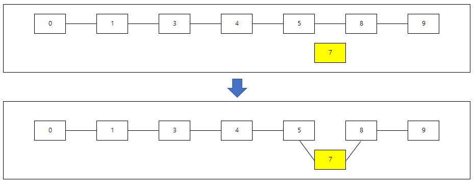 7이 들어온다고 가정하면 5와 8사이에 위치해야합니다. 그러므로 5와 8은 서로 연결되있던 것을 끊어주고 7과 연결해줍니다.