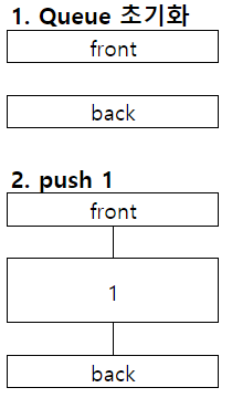 front가 가르키는 노드를 출력하고 back의 다음 노드에 입력된 노드를 연결하여 구현하도록 합니다. front는 가장 앞의 노드를 가르키게 되며 back은 가장 마지막의 노드를 가르키게 됩니다. 데이터를 입력할 때는 마지막 노드의 뒤에 추가된 데이터 노드를 이어서 입력하게 되고, 데이터를 출력할 때는 첫번째 노드의 데이터를 출력하고 다음 노드를 첫번째 노드로 가르키도록 합니다. 링크드리스트를 통해서 큐를 구현하면 큐의 최대 크기를 고려하지 않고 구현할 수 있는 장점이 있습니다.