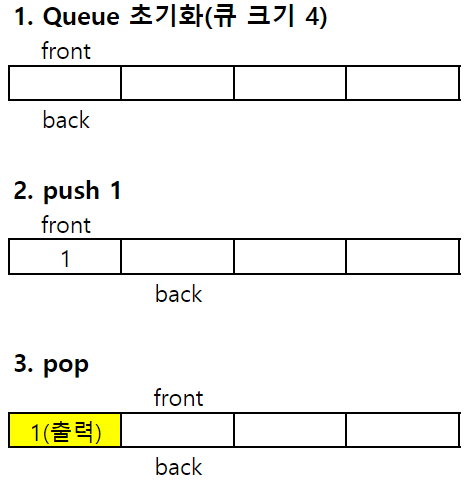 back값은 데이터가 입력 되어야 할 인덱스 위치, front값은 데이터가 출력 되어야 할 인덱스 위치입니다. 마지막 인덱스까지 데이터를 입력하거나 출력했을 때(back값 또는 front값이 마지막 인덱스 값일 때)는 다시 첫번째 인덱스(back값 또는 front값이 0)에 데이터를 입력하거나 출력하도록 구현합니다. 최대로 입력될 수 있는 크기를 고려하여 배열을 크기를 선정하는 것이 중요합니다.
