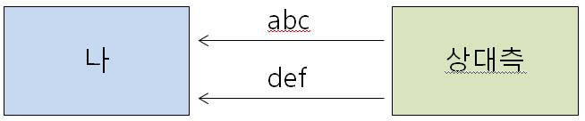위의 그림은 패킷 분리와 반대의 경우로 합쳐지는 경우입니다. 상대측에서 첫번째로 abc를 송신하고 두번째로 def를 송신하였을 때 수신하는 경우에는 abcdef가 한번에 들어오는 경우입니다. 위에서 설명드린 것과 같이 TCP 관련 Layor를 통해서 abc, def 패킷이 합쳐진 후 송신되어 1개의 패킷을 수신하게 됩니다.